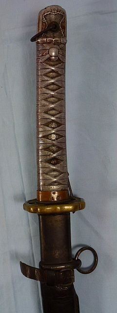 World War II period Japanese Army NCO's shin gunto sword. The aluminum handle shows service wear with most of the brown paint gone. The fuchi hilt collar bears the mark of the Kokura arsenal as well as a Nagoya inspection stamp and the Gifu Sword Company maker's mark. These NCO swords were actually only produced at the Tokyo or Nagoya arsenals. The positioning of the serial number on the sword blade, so that it is read with the cutting edge up, indicates that this blade was manufactured at the Nagoya arsenal. However, the Kokura Arsenal sometimes put its Arsenal stamp on some fuchi and a sword, such as this one, will bear an inspection mark from either Tokyo or Nagoya Arsenals. The use of the Kokura Arsenal stamp indicates it was produced under their administration. The blade bears a number, as does the scabbard, and these numbers do not match, as is often found with the Type 95 swords. The blade has spots and gray areas but there are no chips or active rust. There are perhaps two or three tiny nicks to the cutting edge that are barely perceptible. The blade is approximately 26 1/2 inches long, with an overall length of approximately 37 inches when within the scabbard. The olive brown paint on the scabbard is almost entirely gone, giving the scabbard the appearance of blued steel. The scabbard has one carrying ring and the owner of the sword placed a leather mount on the scabbard which provided a second, lower, carrying ring, a rather unusual feature to see on a sword of this type. The throat screw is missing. This NCO sword was obviously well carried in the field of combat operations. It shows the indications of wear and use as described above, but at the same time these factors make it obvious that this was a weapon that was constantly at the side of, and handled by, a Japanese Army NCO of the Second World War.PLEASE NOTE: Our customers outside of the United States should contact us when purchasing this item so that we can provide you with the cost of shipping to your country.