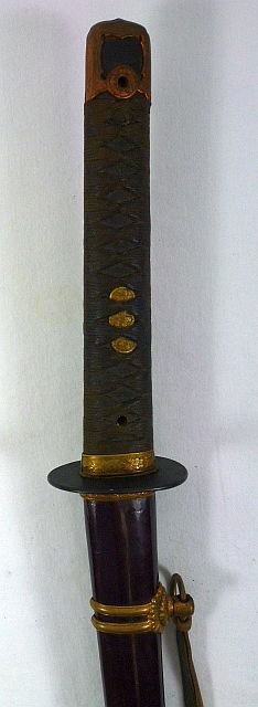 The sword has a blade length of approximately 24 1/2 inches, with an overall length of 35 inches. Thee tang bears the anchor emblem of the Imperial Navy. The blade is quite bright, with a light even temper line. The grip is wrapped in fabric in the traditional style, the fabric being dark from having been handled in a tropical climate. Beneath the wrap is the menuki of three cherry blossoms. The tsuba is a plain iron style. The scabbard is laquered wood in a burgundy color with gilt brass fittings on which some gilt remains. Attached to the carrying ring of the scabbard is an officer's sword knot. The knot shows wear but is in very good condition.