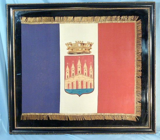 A framed silk French flag that was presented to an American Red Cross worker in 1918 when she was made an honorary citizen of the town of Cahors.The flag is approximately 21 inches by 17 inches with an additional 1 inch of gold bullion fringe. The overall size of the framed flag is approximately 27 inches by 24 inches.On the back of the frame is attached a handwritten statement of provenance. The statement reads:'Flag of Cahors, France. Presented to Alice Ingersoll Stuart (Thornton) December 1918 when she was made an honorary citizen of Cahors by act of the Municipal Council at the completion of her Red Cross work in the Department of the Lot (France). The flag is made of ribbon sewed together by Madame Marie Due of the local branch of the French Red Cross. Her husband painted the coat of arms of Cahors on the white ribbon, which symbolizes the famous Port Valentre, built across the river Lot at Cahors and is one of the oldest and most perfect medieval bridges in France. The flag was presented at a public ceremony attended by the Mayor, the Prefect, and the local French Red Cross. [Signed] Alice Ingersoll Thornton, Washington, October 3, 1950. For the American Red Cross Museum.'The exact nature of Mrs. Thornton's work in France is not known, but it must have been exceptionally significant. According to a newspaper article in The Washington Times of November 14, 1919 (page 11), she was a citizen of Washington, D.C. Her husband, a Canadian, was killed in action in 1917. As a result of her work in France for the Red Cross she was made an honorary citizen of twenty French towns. She was also decorated twice by the French Red Cross and once by the French government.The flag is in excellent condition. The frame is in very good condition with minor nicks. There is some brown paper missing from the reverse of the frame. The interior of the glass could use a cleaning.Overall excellent condition for a very impressive World War I presentation flag.