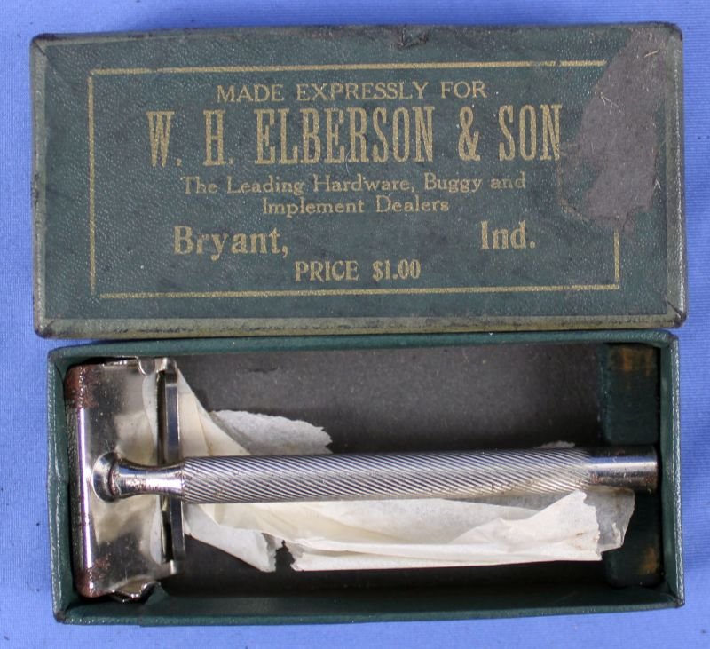 The plated razor shows some spots of rust. The razor is manufacturer marked and it is contained within its original box. The box exhibits soiling but it is intact.