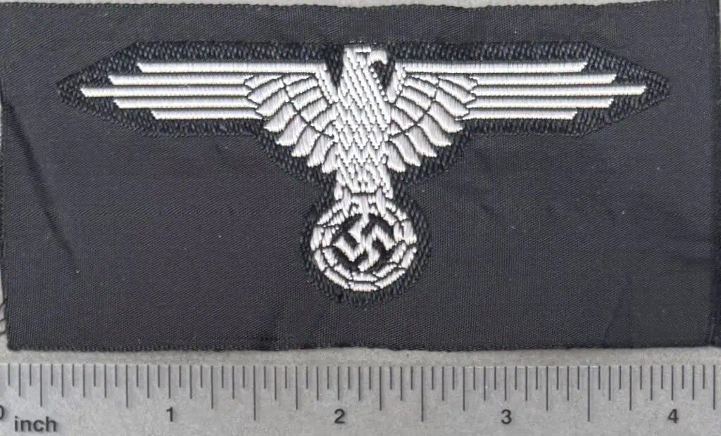 SOLDOriginal WWII German Waffen SS EM/NCO'S SLEEVE EAGLE. (SS-Ärmelhoheitsabzeichen) Brought Home By A U.S. Veteran. The Allgemeine-SS, (General-SS), was originally formed in May 1923 as the Stosstrupp Adolf Hitler (Shock Troops Adolf Hitler), and was redesignated Schutzstaffel, (Protection Squad), in April 1925 with the official acceptance of the name verified on the second anniversary of the failed Munich 'Beer-Hall' Putsch on November 9TH 1925. On January 6TH 1929 Heinrich Himmler was appointed as Reichsführer-SS, (National Leader {of the} SS), and on July 20TH 1934 shortly after the, June 30TH 1934, purge of the SA, Sturm Abteilung, (Storm Troopers) on the 'Night of the Long Knives', the SS was rewarded by Hitler by being granted the status of an independent organization under direct control of the NSDAP, Nationalsozialistische Deutsche Arbeiterpartei, (National Socialist German Worker's Party). The first pattern SS sleeve eagle was officially introduced in May 1936 although photographic evidence indicates that it was in use as early as the summer of 1935. Shortly after its official introduction the eagle underwent minor modifications resulting in the second pattern that was worn for the duration of the war. These second pattern eagles were originally issued in a hand embroidered version for Officer's ranks and a machine embroidered version for EM/NCO's until a machine woven version was introduced in 1939. Of Note: The RZM, Reichzeugmeisterei, (National Equipment Quartermaster), was official founded in June 1934 in Munich by the NSDAP as a Reich Hauptamt, (State Central Office), and was based on the earlier SA Quartermaster's Department. The functions of the RZM were not only to procure and distribute items to Party formations, including the SS, but also to approve chosen designs and to act as a quality control supervisor to ensure items manufactured for the Party met required specification and were standardized. Starting in late 1934 items manufactured for the SS came under the quality control of the RZM and were marked with an RZM/SS approval tag. In 1943 the Waffen-SS assumed full control over their uniform item production and no longer fell under the authority of the RZM. Second pattern, (Circa 1939-1945), machine embroidered, SS sleeve eagle with out-stretched wings in silvery/grey, rayon threads on a black wool base. This is the final pattern machine embroidered version. These are the type that came out of Dachau Concentration camp! 100% guaranteed to be authentic with Museum COA (Certificate Of Authenticity). This SS eagle is one of the desirable artifacts from the Third Reich. DO NOT MISS THIS! OUTSTANDING EXAMPLE! SS Items are RARE and desirable to collectors and historians! It has been over a year since we have offered one of this type!