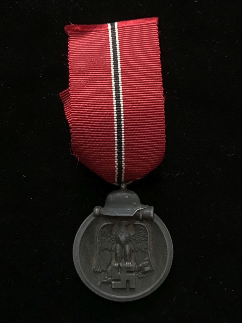 Original WWII German Eastern Front or 'Russian Front' Medal Brought Home By A U.S. Veteran. Russian front 'frozen Meat Medal' was the slang term for this award. The Russian Front Medal was instituted by Adolf Hitler on May 26TH 1942 to commemorate the first winter campaign in Russia. The award was available to all Wehrmacht personnel, civilians and foreign volunteers who met the required criteria with the main qualification being at least fourteen days of participation in combat on the Russian front. Die struck, alloy construction, medal with a silver washed outer rim and helmet, and a blued center. The obverse of the medal features a recessed outer rim with an embossed helmet and stick grenade to the top center and a high relief Wehrmacht style national eagle with down swept wings, clutching a static swastika in its talons which is superimposed on a laurel leaf sprig to the center. The reverse of the medal features a recessed outer rim with a smooth background field with embossed Latin script to the center, 'Winterschlacht Im Osten 1941/42', (Winter Battle in the East 1941/42), above a crossed sword and laurel leaf sprig. The medal loop and the ribbon suspension ring are both intact. We recently obtained a large collection of German medals brought home by a U.S. Solider as war trophies. Well marked. We have several from a large collection, we will select the best one for you. All in good condition with minor storage wear to the cloth and ribbon. Offering is for one (1) medal. An honest untouched U.S. Veteran bring back German Eastern Front Medal. Gettysburg Museum Certified (COA) provided. Very limited supply. Here is an opportunity to obtain a 100% authentic and iconic WWII era German medal that is Museum certified for a reasonable price. Also note when browsing our web site there are several pages of items, at the bottom of the list look for other page numbers.