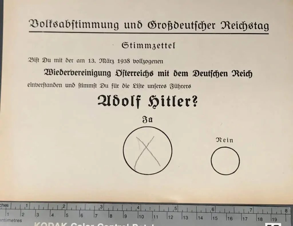 Original 1938 German ADOLF HITLER REICHSTAG REFERENDUM BALLOT VOTE 'JA' For Hitler! Certified By The Gettysburg Museum Of History