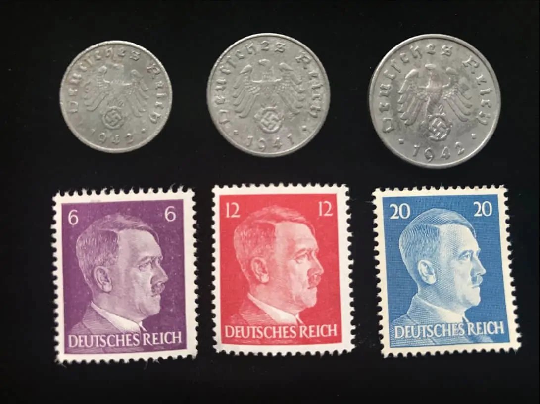 Authentic WWII Era German Nazi 3 Stamp And 3 Coin Set Certified By The Gettysburg Museum Of History