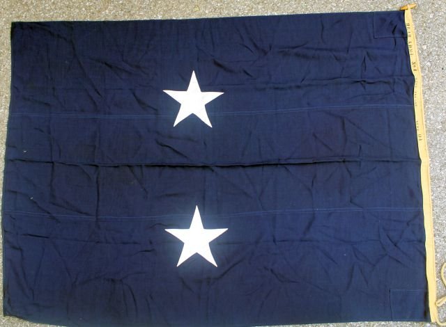 Wool bunting flag measuring 57″ X 77″ with tan canvas heading , threaded through with a braided rope with wood toggle at one end. Stamped on the heading 'REAR ADML No 4 MARE ISLAND SEPT 04'. Wool exhibits strong colors with a few small holes, white cotton stars with no staining.