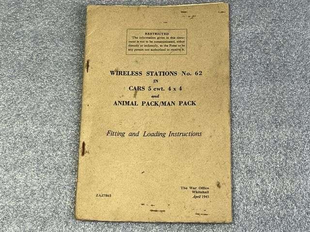 3) Original WW2 Pamphlet Wireless Stations No 62 Cars 5 CWT 4X4 Animal Pack/Man Pack Fitting & Loading Instructions 1945