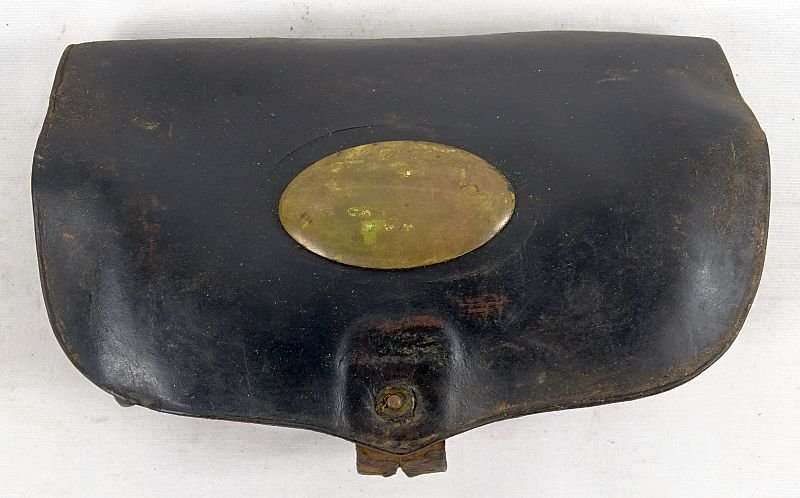The cartridge box is approximately 7 inches wide by 4 inches tall by 1-1/2 inches deep. The cover bears a plain brass oval plate with uncleaned patina. The flap closure strap is dry and shows flaking but it remains pliable and intact. The interior fabric cartridge loops are present. The reverse belt loops are present and intact. The cartridge box shows age and scuffs but overall it is in very good condition.