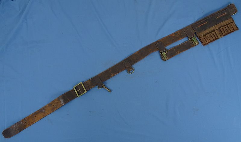 The belt shows use, wear and age, with scuffing of the leather and with the visible 'powdering' of the surfaces that is a typical result of some leather tanning processes. The belt remains pliable, complete and intact. The cartridge belt hanger bears the Anson Mills manufacturer plate, while the belt itself has the faintly visible impressed name of the Rock Island Arsenal.