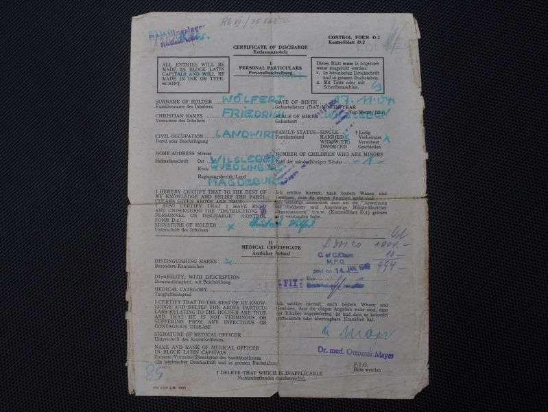 British army certificate to ex Nazi army soldier Freiedrich Wolfert