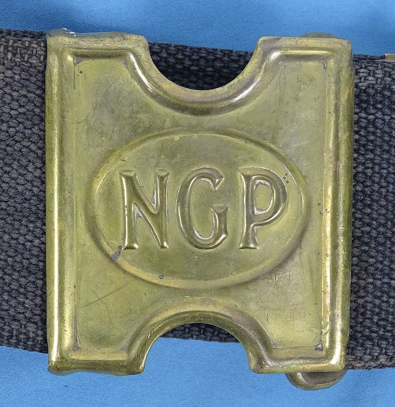 The black fabric belt has 45 cartridge pouches and it is in excellent condition. The Pennsylvania National Guard belt plate is manufacturer marked by Anson Mills and bears a patent date of 1881.