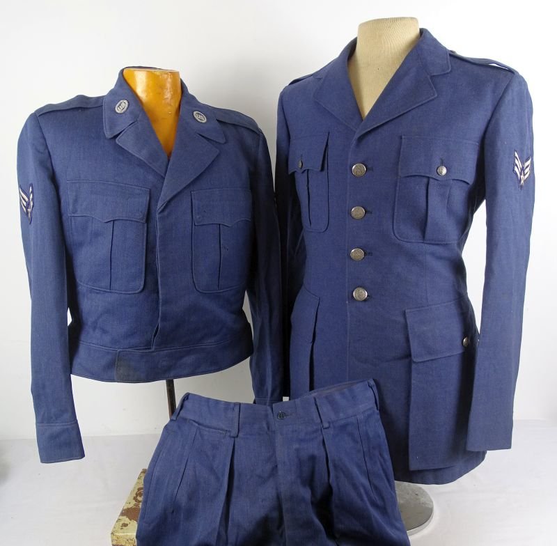 Originally, members of the Air Force were allowed to wear the olive green uniform of the Army Air Force until June 30, 1952. The first Air Force-specific service uniform was created in 1949, with the Air Force adopting the 'Ike' style jacket in a shade designated 'Winter Blue Shade 84'. The group is comprised of a privately tailored 'Ike' jacket, a four pocket tunic with quartermaster tag dated 1951, and a pair of the blue uniform trousers, all in blue wool. Both uniform jackets have Air Force Sergeant chevrons. The Ike jacket has separately applied 'US' collar insignia in silver bullion. The Ike jacket shows actual wear, with some tracking, spots, and scattered small holes. The four pocket tunic is very clean and without holes or tracking. The trousers show multiple holes that are noticeable.