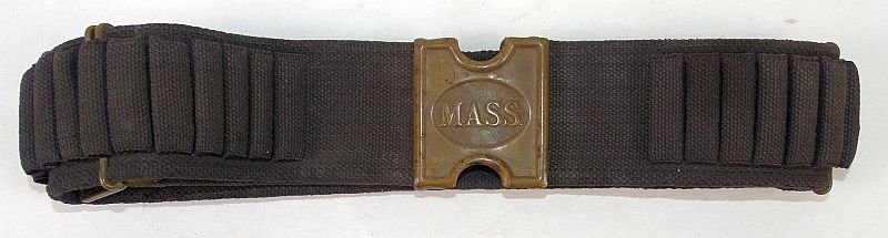 The cartridge belt is dark blue fabric with a brass Massachusetts belt plate that shows dark patina. Both the belt plate and the belt brass end are manufacturer marked. The belt retains the brass wire bayonet suspension device which is retained by placement over the top edge of the belt, this example being without grommets for securing the bayonet suspension piece. Very good condition.