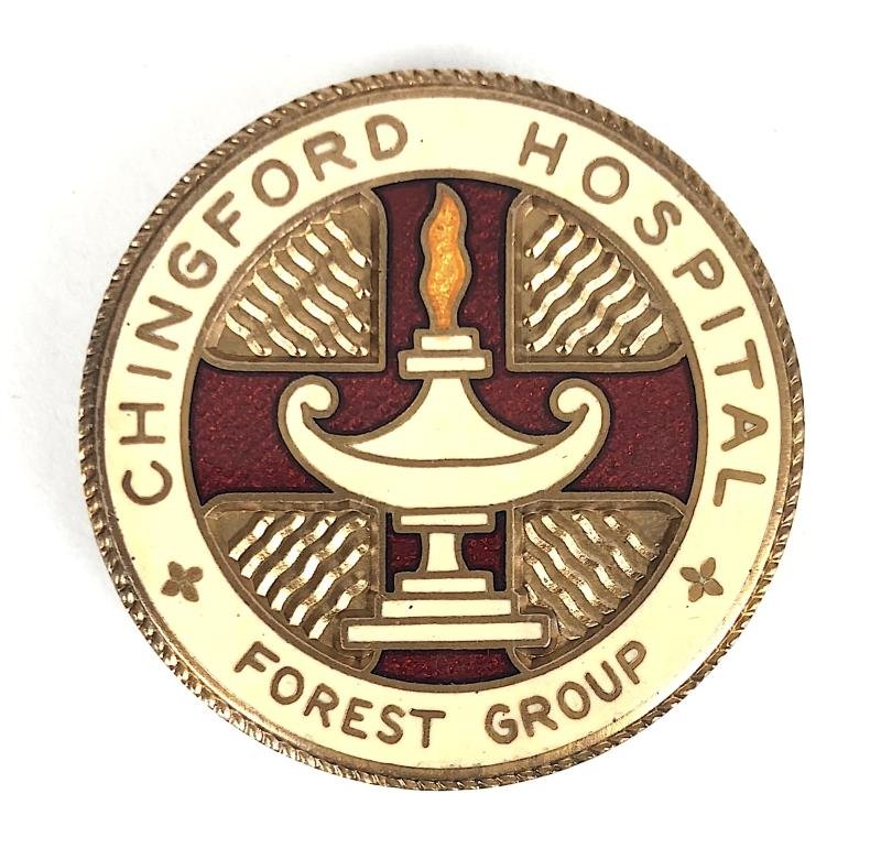 A good original circa pre 1970's 'Chingford Hospital nurses gilt brass enamel badge' displaying a white enamel title surround, embossed red cross with lamp to centre on gilt stippled ground; the reverse impressed with maker's details 'Thomas Fattorini Regent St Birmingham'. Very good condition, complete with original pin fittings, no defects to the enamel.Diameter approx 32mm.