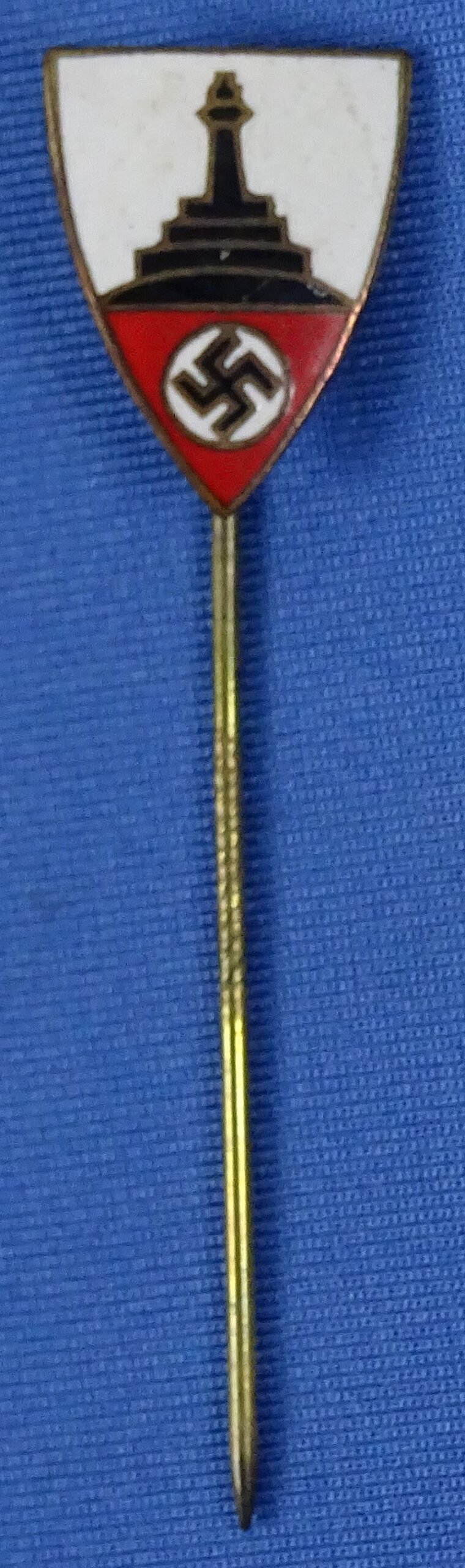 The enamel badge is without chips or cracks and it is mounted on a knurled pin. Very good condition, 1/2 X 3/4 inch.