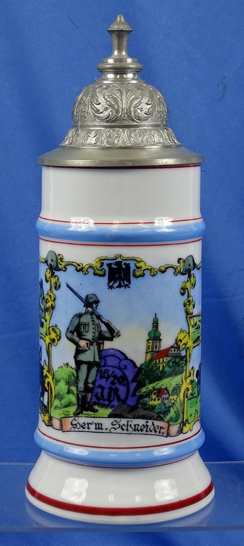 The porcelain half liter stein is approximately 10 inches tall. The stein has a lithopane base and it is in near mint condition, without chips or cracks.