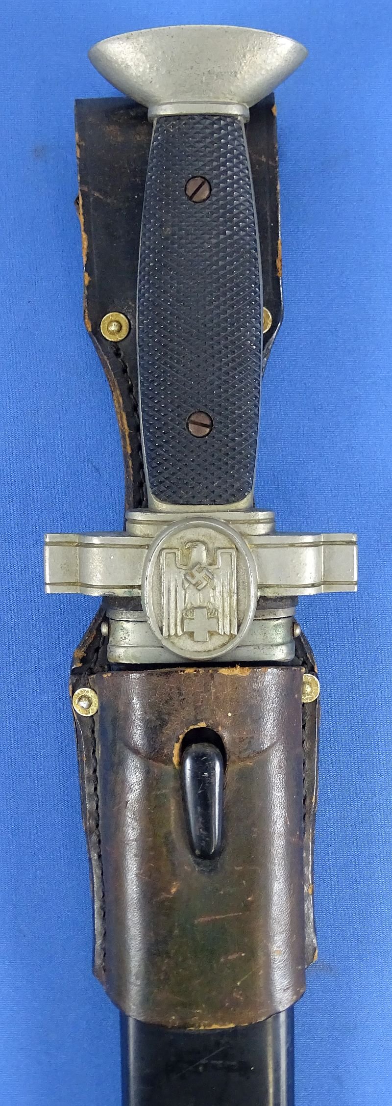 The blade shows spots, stains and surface dirt, but crossgrain is visible and the blade is generally clean. The reverse ricasso is marked 'Ges. Geschutzt' beneath the langet. The grip plates are without chips or cracks. The guard and pommel exhibit uncleaned patina as well as some spots of verdigris. The black scabbard paint is largely intact, showing some scratches and chips. The leather frog shows age and scuffs, but it is intact. The reverse is manufacturer marked and dated 1940. Overall very good condition.