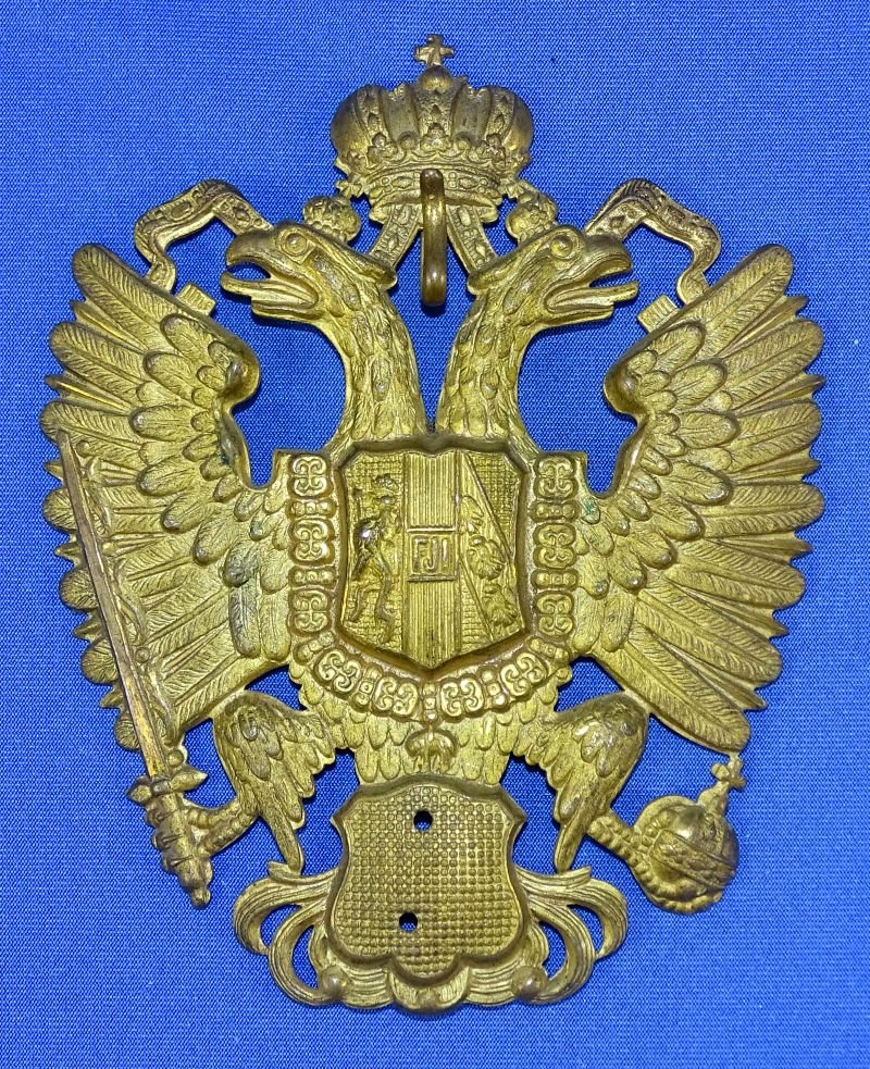 Approximately 4 inches by 4-1/2 inches. The shako plate shows age toning of the fire gilt finish but the finish is largely intact. The attachment prongs are intact on the reverse and there is a hook below the crown on the front. The lower front of the shako plate has two small holes within a shield. 3-1/8 X 4 inches.