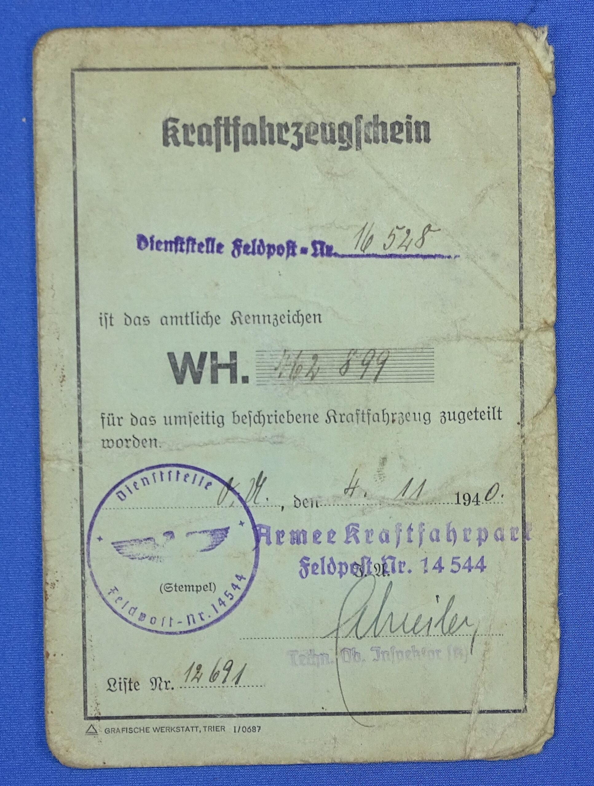 Approximately 4 inches by 5-3/4 inches when closed. The 'Kraftfahrzeugschein' Motor vehicle registration document) was issued in 1940 by the 'Armee Kraftfahrpark' ('Army Motor Vehicle Depot') at Feldpost Number 14544, which was Army Kraftfahr-Park 521. The document shows wear and some soiling but it is intact.