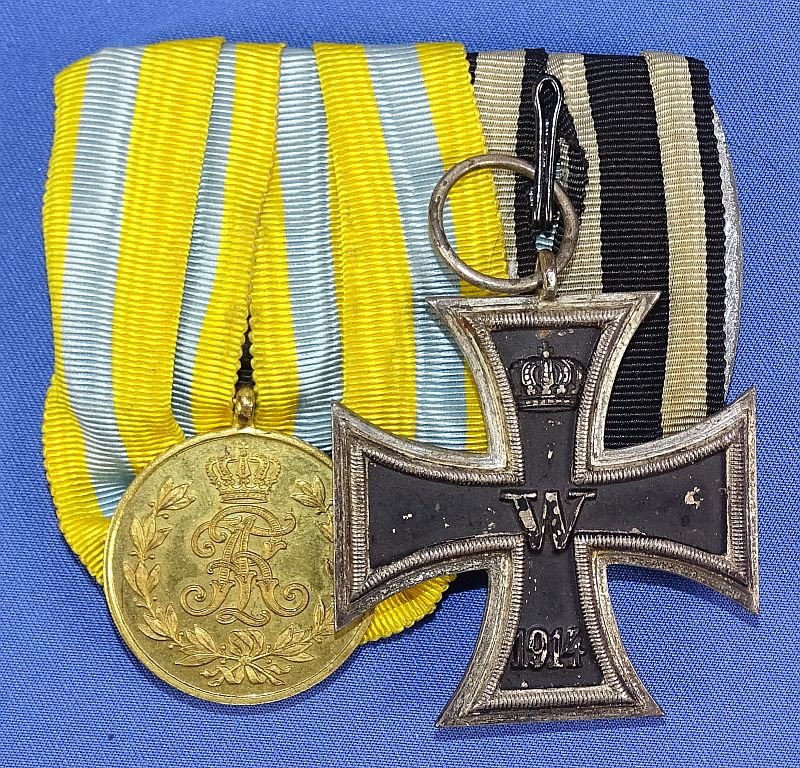 The medal bar carries the Saxon Friedrich August Medal in gold; and the 1914 Iron Cross Second Class. The Iron Cross shows some chips and wear to the pant, with patina on the silver frame. The medals have furled ribbons with a wool backing. Very good condition.