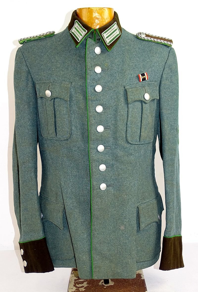The tunic is tailored from a service quality wool in the blue-green color of the German police. The shoulders carry the slip-on rank boards of a Wachtmeister in the Schutzpolizei. The left sleeve bears the machine embroidered green police eagle which is hand sewn to the tunic. On the upper left breast is the single ribbon bar for the 1939 War Merit Cross with Swords, a decoration that was frequently given to police personnel who were involved in anti-partisan actions. The ribbon bar is pinned through a short set of loops. The interior lining has a separation at the top below the collar. The tunic is generally clean and, while it shows signs of actual wear and use, with some subtle spots and surface soiling, it is without stains, or distracting issues. There is a small period repair of a hole on the lower left front, and the tunic exhibits typical wear to the wool nap, but overall the tunic is in very good condition.