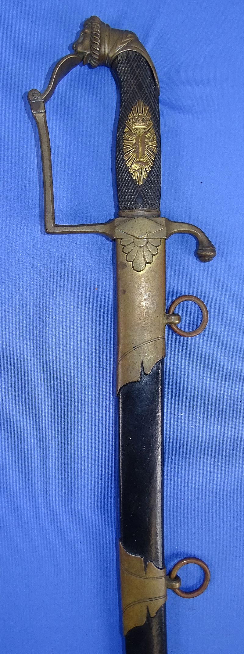 The 19th century Bavarian officer's lion head pommel sword has an overall length in the scabbard of approximately 39 inches, with a blade length of approximately 32 inches. The blade bears the cypher of King Ludwig I, who ruled from 1825 until 1848. The sword has a slightly curved blade that is triple engraved for approximately half of its length. The blade has a generally gray patina with some typical spots and smudges. The grip is wood with a Bakelite type of covering. The obverse side of the grip is a checked texture with an applied brass emblem of King Ludwig, the insignia showing some gilt finish remaining on the emblem. The reverse side of the grip exhibits a grooved texture to the Bakelite, with some loss of the cover material at the top. The sword has its metal scabbard, painted black, with brass mounts. The scabbard paint is largely intact, and the brass mounts, like the hilt of the sword, all show an uncleaned patina.