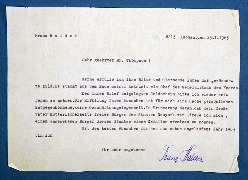 Typed letter signed, dated January 25, 1963. The letter is typed on onion skin paper and clearly signed 'Franz Halder'. Approximately 5-5/8 inches by 8 inches. Excellent condition.