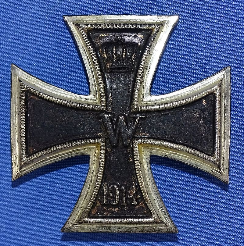 A lighter weight 1914 Iron Cross first Class, lacking the pin. The paint on the core shows some wear. The plated finish on the frame is largely intact.