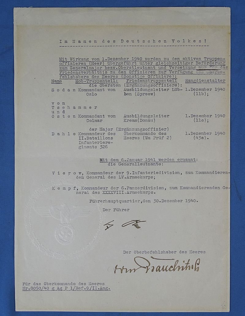 1940 Promotion Document Signed by Adolf Hitler and Army CIC Walther von Brauchitsch – To Panzer General Werner Kempf Oakleaves Awardee