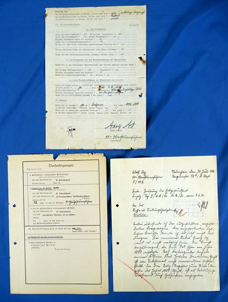 The three documents consist of an SS form titled 'Vorbedingungen', double sided, approximately 8-1/8 inches by 11-1/2 inches; a handwritten document, double sided, approximately 8-1/2 inches by 11 inches; and an SS form titled 'Fragebogen'. All three documents show age toning and edge tears. All three documents are signed by Ax, who served as commander of the 32nd SS-Freiwilligen-Grenadier-Division '30. Januar' and who was recommended for the Knight's Cross in April of 1945, with that recommendation being sent to the Army Staff Office on April 25, 1945. With the end of the war only days away, no official action was thereafter apparently formalized, but the Order Commission of the Association of Knight's Cross Recipients (AKCR) processed the recommendation in 1981 and decided that the Knight's Cross was awarded affective 9 May 1945.