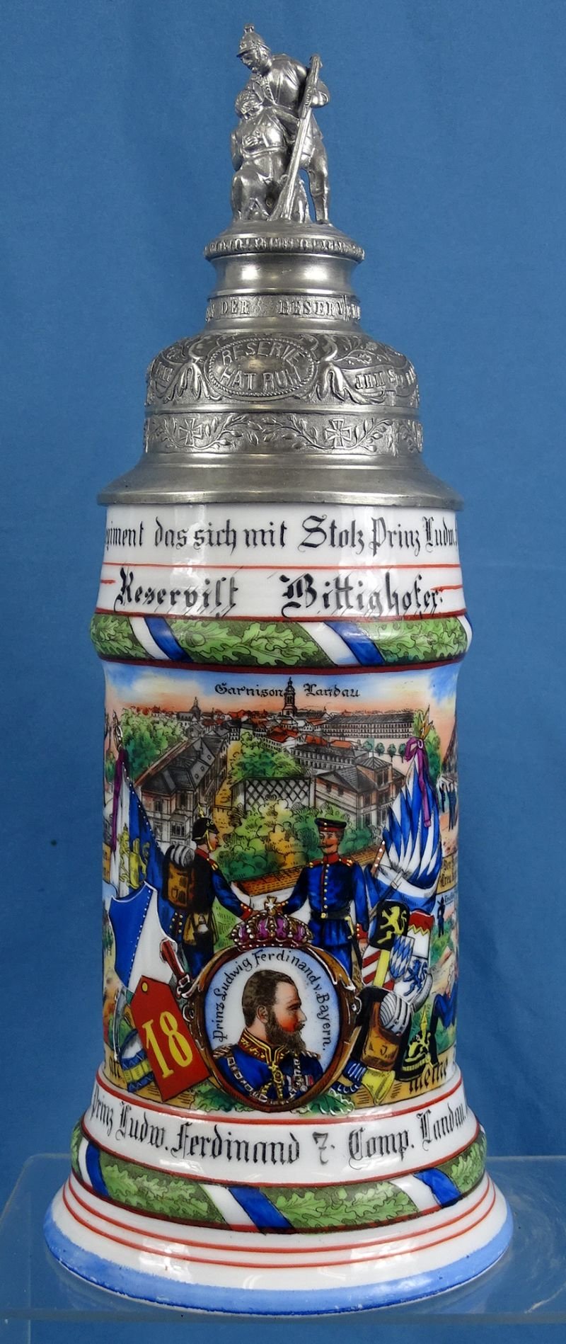The half liter porcelain stein is approximately 11 inches tall, with a lithopane base. The stein is named to Reservist Bittighofer, who served in the unit from 1906 to 1908. The stein shows some signs of age, and it has a faint lithopane line, but overall it is in near mint condition, without chips or cracks.