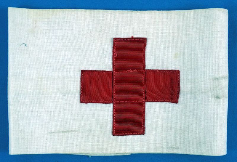The white cotton armband has unsewn ends. The white cotton armband bears a separately sewn Red Cross insignia. The armband shows some spots and minimal soiling from wear.