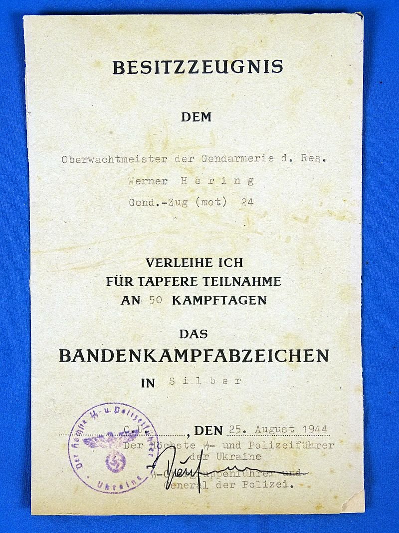 1944 Award Document for the Anti Partisan Badge in Silver to a Reserve Gendarmerie Oberwachtmeister Signed by Hans-Adolf Prützmann, Higher SS and Police Leader for the Ukraine