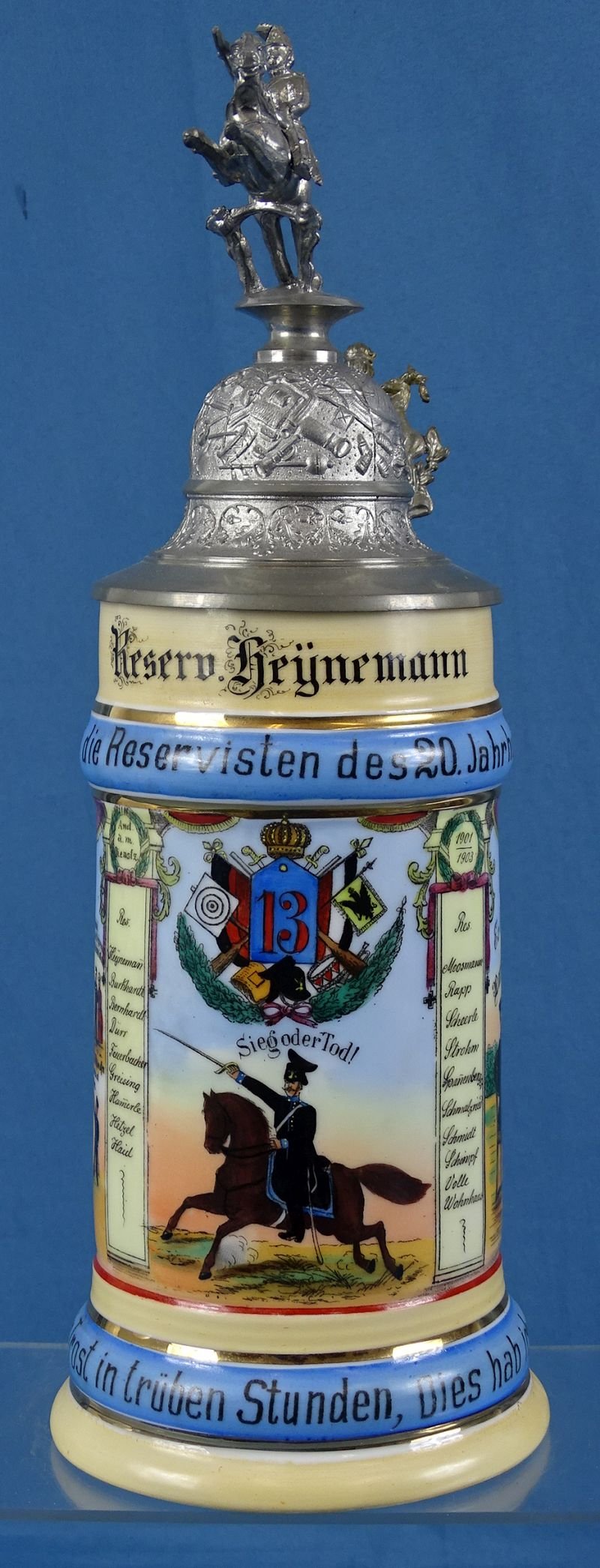 The half liter porcelain stein has an overall height of approximately 11 3/4 inches tall. The stein is named to 'Reservist Heynemann', who served in the unit from 1901 to 1903. The stein has bright colors and very minor wear, being in near mint condition. The rear of the stein base has a farewell scene lithopane.