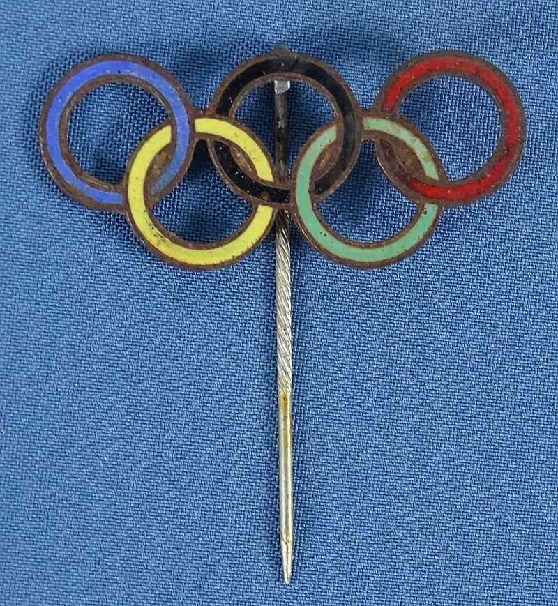 The enamel rings stickpin is approximately 1-1/8 inches wide on a knurled pin. The enamel shows some verdigris, while the reverse shows surface rust.