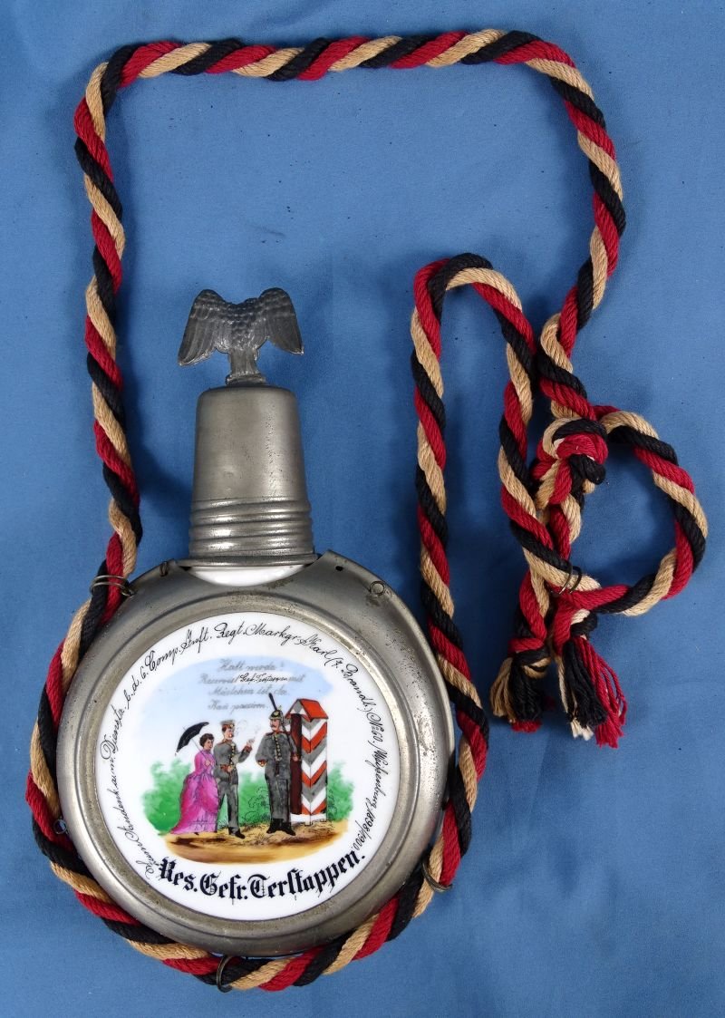 The porcelain disks on each side of the flask are without chips or cracks. The flask is named to Reseve Gefreiter Terstappen, who served in the unit from 1898 to 1900. The red, white and black hanging cord remains with the flask, although several of the rings which retain the cord on the ides of the flask are missing. The interior metal closure cap is present beneath the decorative drinking cup top. The flask and top have an uncleaned patina. Overall very good condition.