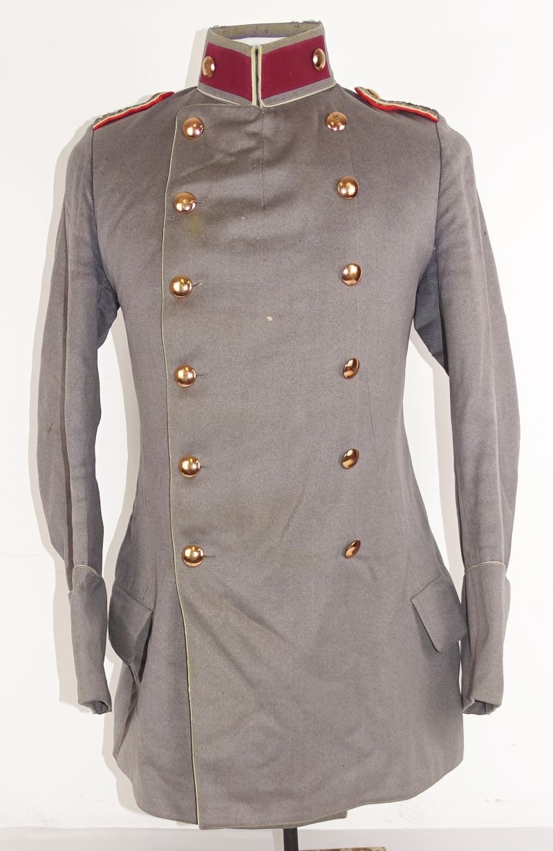 The tunic is tailored in a fine quality dove gray wool, with maroon wool collar tabs. The Oberleutnant shoulder boards bear the monogram of 'Kaiser Franz Joseph von Osterreich, Konig von Ungarn' (Emperor Franz Joseph of Austria and King of Hungary). The exterior of the tunic shows scattered holes and some light spots, and there is a small, old repair to the right sleeve. The top edge of the collar shows wear. The collar, cuffs, and front fly are piped in white while the shoulder boards have white piping with red underlay. The interior is fully lined. The inner pocket bears the label of a Dresden tailor, and the label is dated 1903 and named to 'Oberleutnant M. Rossberg'.