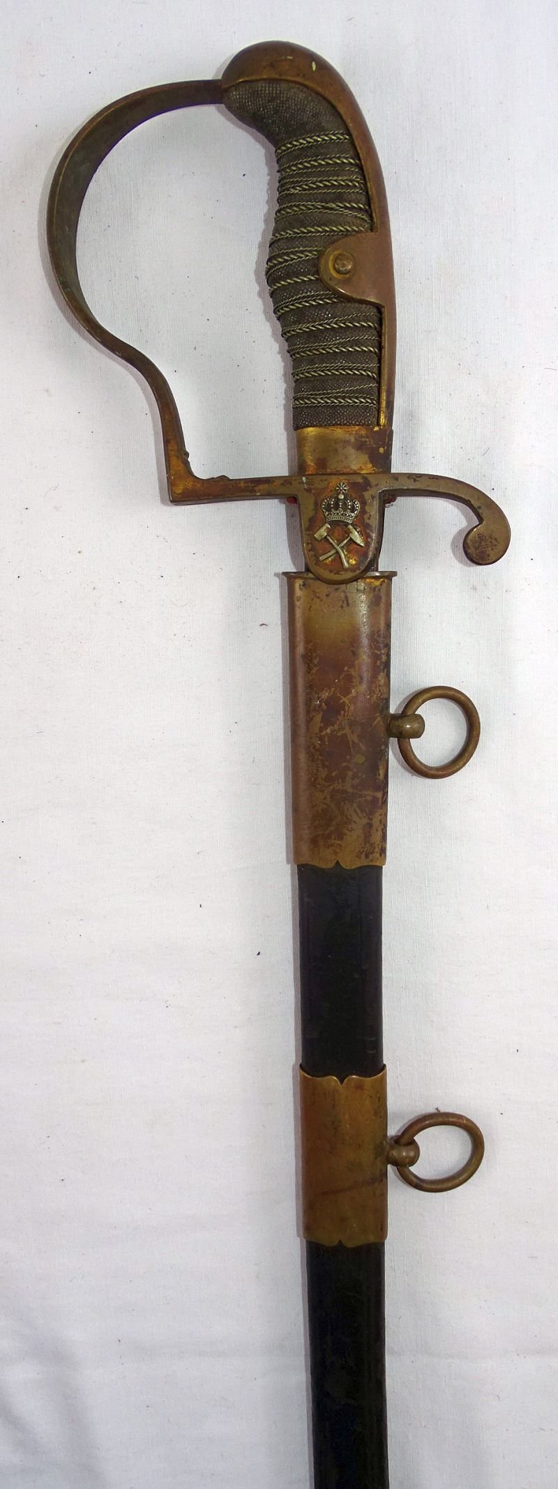 The sword has an overall length in the scabbard of approximately 36 1/2 inches. The guard and back strap are plain and have a dark, uncleaned patina. The langet displays a detailed Prussian crown and the crossed miner's hammer and mallet emblem of the mining association. The plated blade is triple etched with both floral and military designs as well as with crossed hammers, with the blade having dark spots and areas of surface rust. The ray skin grip is triple wrapped with wire. The leather scabbard appears to have shrunk, and the sword does not completely sit within the scabbard, extending approximately 3/4 of an inch above the scabbard throat. The scabbard is complete and intact.