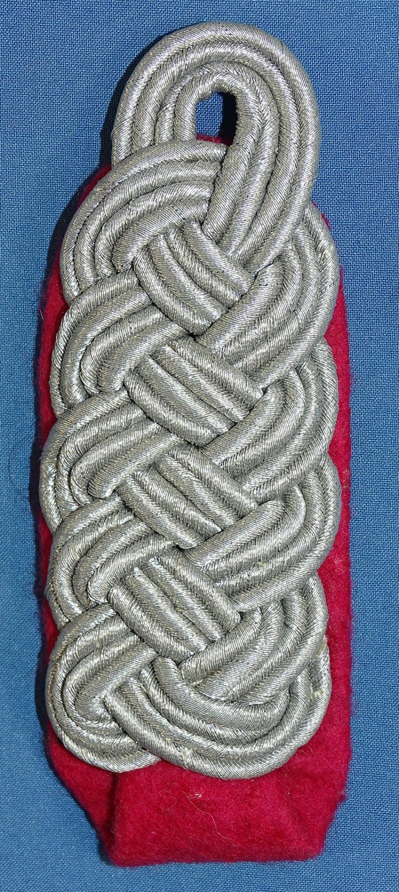Silver braid with crimson underlay. Very good condition.