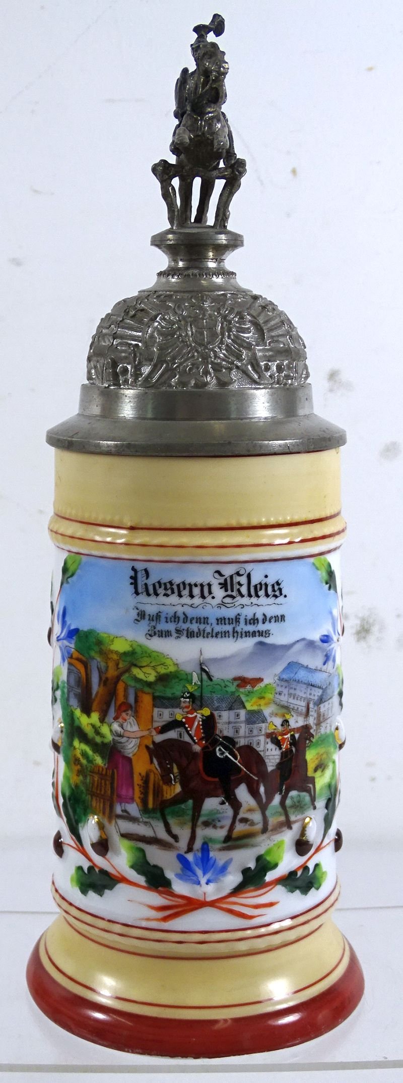 A half liter stein approximately 11 inches in overall height, named to Reservist Kleis, who served 1896-1899. The stein features a unit roster and a domestic scene lithopane. Excellent condition, without chips or cracks.