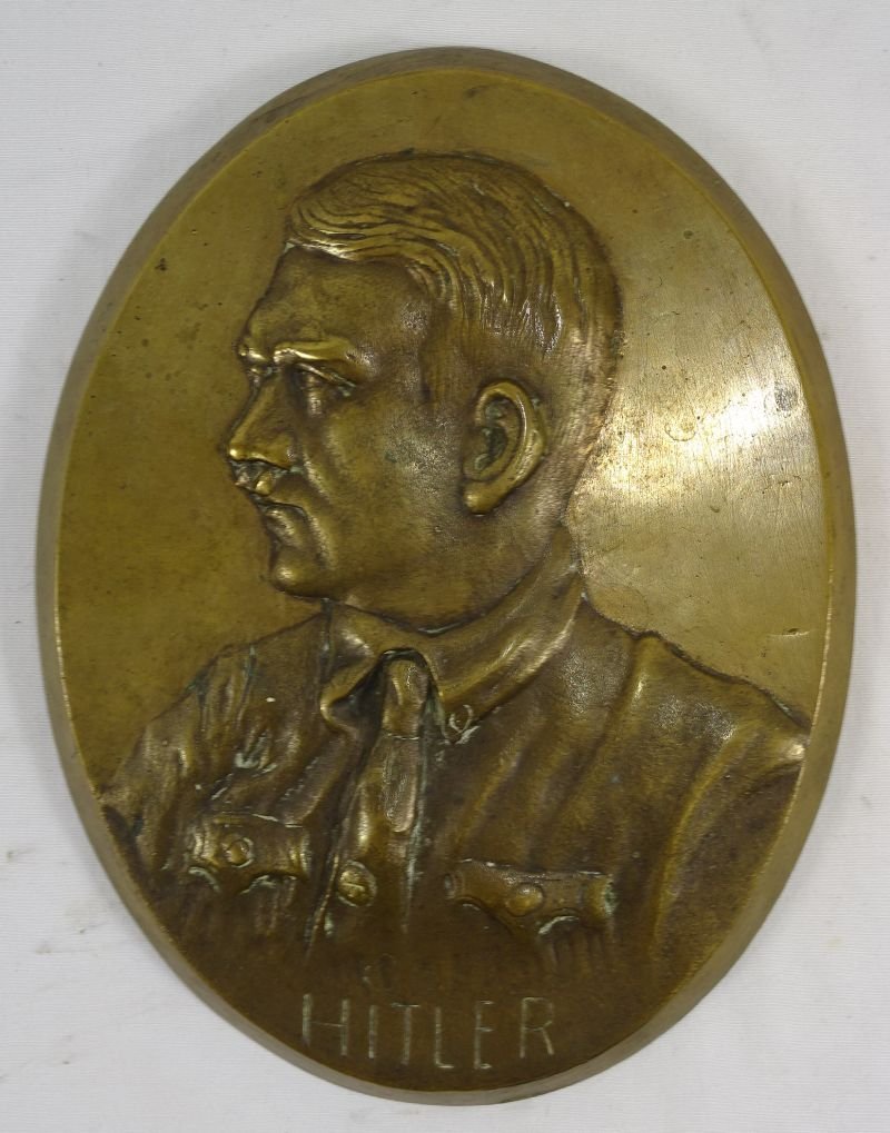 A heavy relief cast bronze oval plaque depicting Adolf Hitler wearing a brown shirt with party pin on his tie. The plaque remains in excellent condition and retains a nice mellow finish.