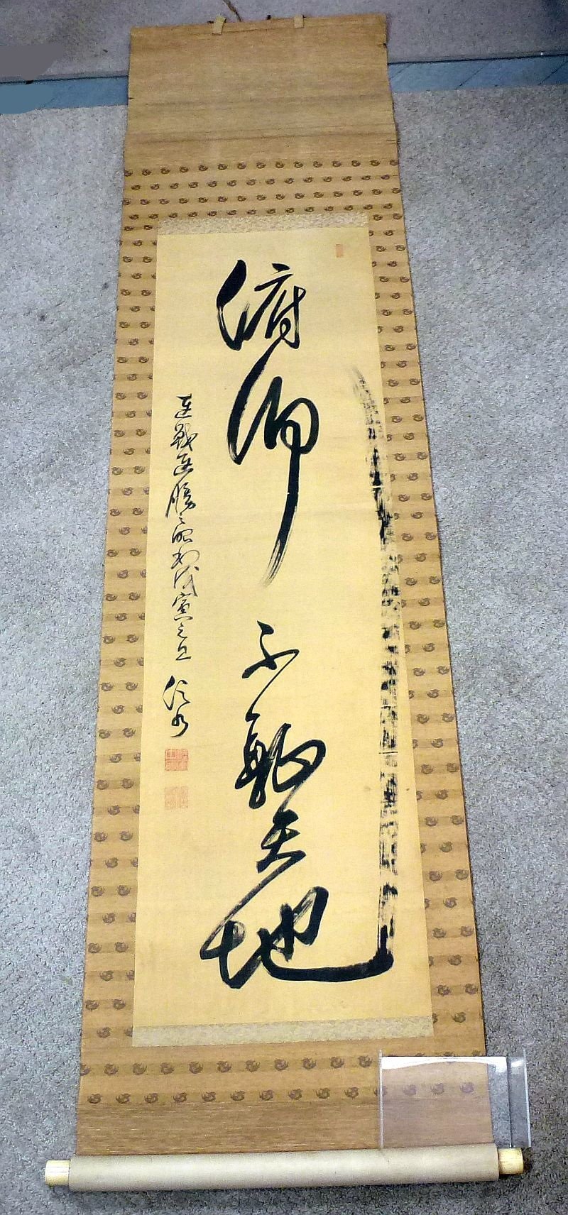 The scroll is approximately 19 inches wide by 84 inches (7 feet) long. The scroll retains closure ties and a hanging cord. Overall very good condition.