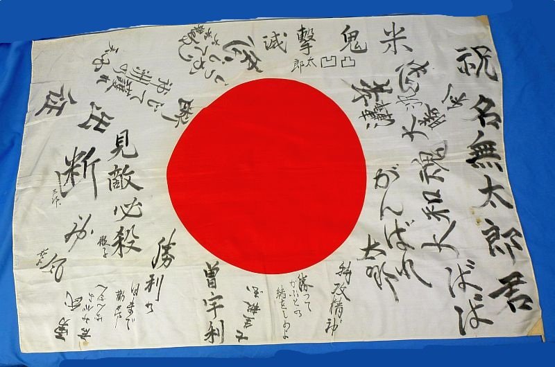 The signed silk Japanese flag is approximately 29 inches by 43 inches. Two corners are reinforced and have cord ties. The flag shows some spots a a few small and rather inconspicuous holes, but overall the flag is in very good condition and it makes an impressive appearance. One of the signatures was executed with a Japanese pictogram called a 'Deko-boko', with the signature then becoming 'Deko-boko Taro'. By definition, 'Deko-boko' means 'unevenness; roughness; ruggedness; or bumpiness'.In Japanese, it is common to refer to strengths and weaknesses together as 'Deko-Boko'.'Deko' refers to protruding parts as strengths or advantages, and 'Boko' refers to recessed parts as weaknesses or challenges. 'Deko-Boko' is also used to describe physical shapes.