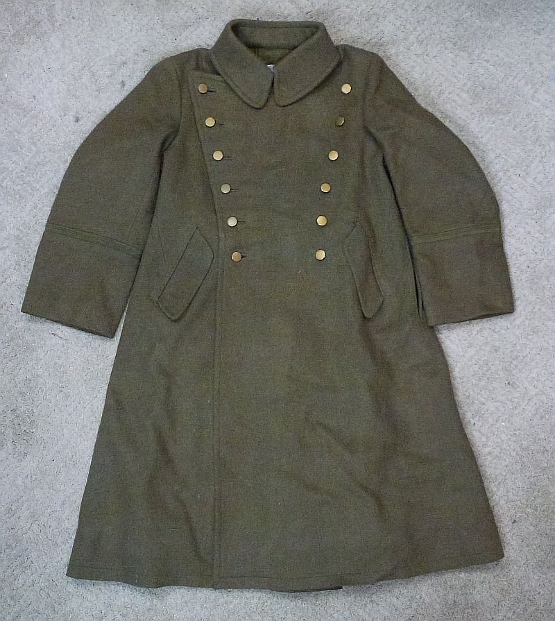 The high quality heavy wool overcoat is in excellent condition, without holes, damage or repairs. The coat retains all buttons. The tailor label is intact on the interior, which also bears an embroidered name tag. Each cuff with a thin sleeve stripe indicating a warrant officer rank. Exterior buttons on the outside are false, with another set of buttons on the interior.