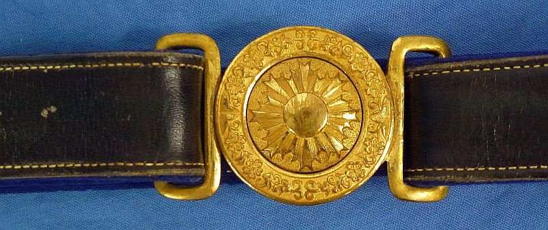 The black leather belt is approximately 30 inches long in its present configuration, adjustable to a loner length of a few inches. The interior blue wool lining of the belt shows scattered holes. The two piece gilt buckle exhibits uncleaned patina. Overall very good used condition.