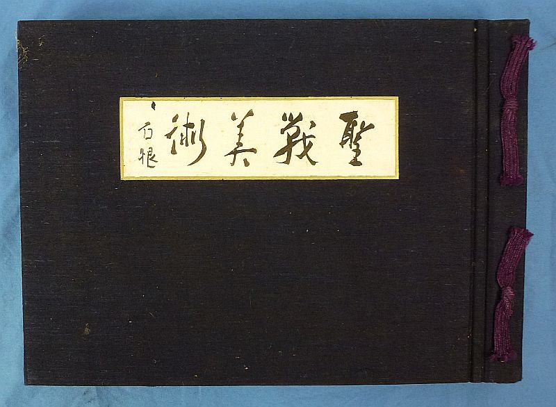 Hardcover, with cloth covers. Published 1942 by the Army Art Association (Tokyo). Approximately 10-1/4 inches by 14-1/2 inches. The cover has the title of 'Holy War Art' and the printed signature of General Matsui Iwane. The pages are unnumbered. The book contains numerous images in both black and white and color, all depicting Japanese war art in various mediums, including oil paintings, drawings, and sculpture. The color artworks include 'Attack on Nanyuan' and 'At the Nanxing Bridgehead in Hangzhou'. The book is in excellent condition.