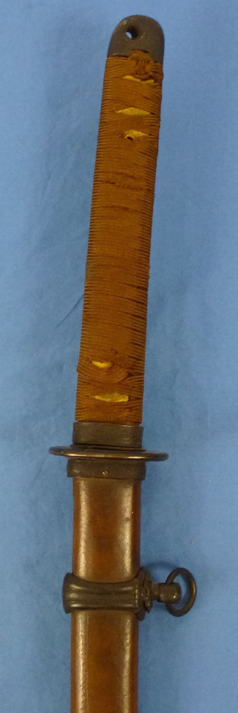 The katana is mounted in the late war variation fittings for the swords of Imperial Army officers. The sword has an overall length in the scabbard of approximately 39 inches, with a blade length of approximately 25-1/2 inches. The blade is somewhat cloudy in appearance as a result of surface dirt and typical spots are present, but the blade has a visible temper line and it is without nicks, chips or active rust. The grip has a tight weave of golden brown tape, which shows a just a bit of wear and fraying. The grip lacks the usual decorative menuki of three cherry blossoms. The late war pommel and the tsuba guard are plain and black in style. The tang has two mounting holes and it is signed 'Muneyoshi'. The steel scabbard exhibits wear to the exterior brown paint, with the paint being approximately sixty percent intact. Overall very good condition.