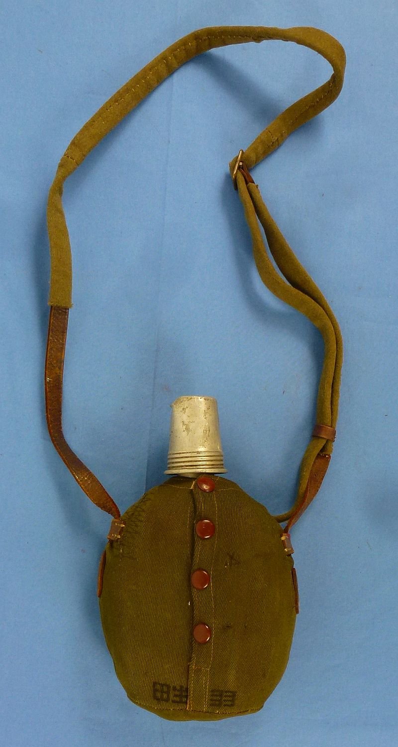 The canteen is complete with the full shoulder strap and all cover closure snaps are intact. The cover has kanji characters at the bottom of the obverse side. The cover has a stitched repair to the obverse shoulder, while the rear of the canteen cover has a split above an old stitched repair. The drinking cup cap has a compass set into the base, with the cup having some indentations to the base edge. The canteen lacks the stopper under the cap.