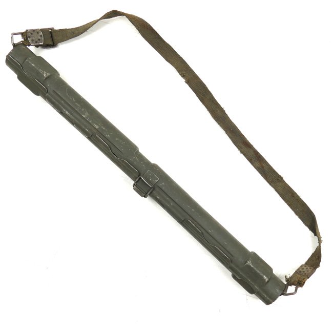 German Spare Barrel Carrier Model 1943 (Laufschützer 43) as introduced in 1943 for use with both the MG34 or M42 type of barrels. The fieldgrey painted barrel carrier is nicely maker marked and dated 'brc 43' indicating production in 1943. It is complete with its original canvas carrying sling, the sling is showing clear traces of usage but still strongly attached. Nice and hard to find original example in good used condition!