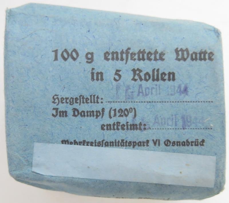 German Wehrmacht Medical 100 g entfettete Watte Wehrkreissanitätspark VI, (Münster, Osnabrück), April. 1944, Mint Unused.