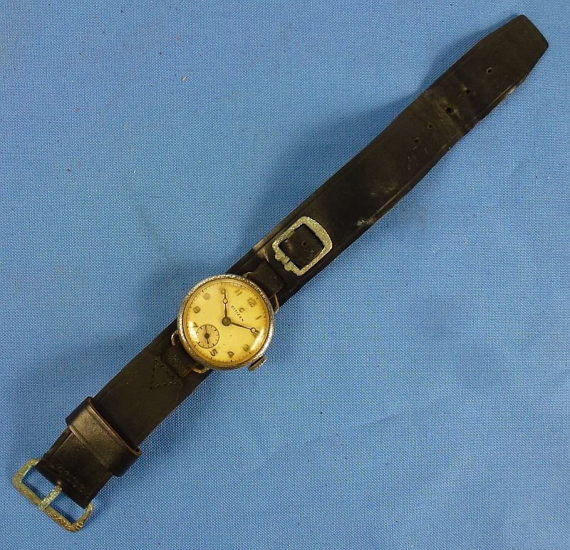 The Citizen brand wristwatch has a diameter of the watch case of approximately 1-1/8 inches, inclusive of the crown. The crystal exhibits some yellowing from age. The crown can be withdrawn and the hands adjusted, but the crown does not turn to wind the watch and the watch is not presently running.